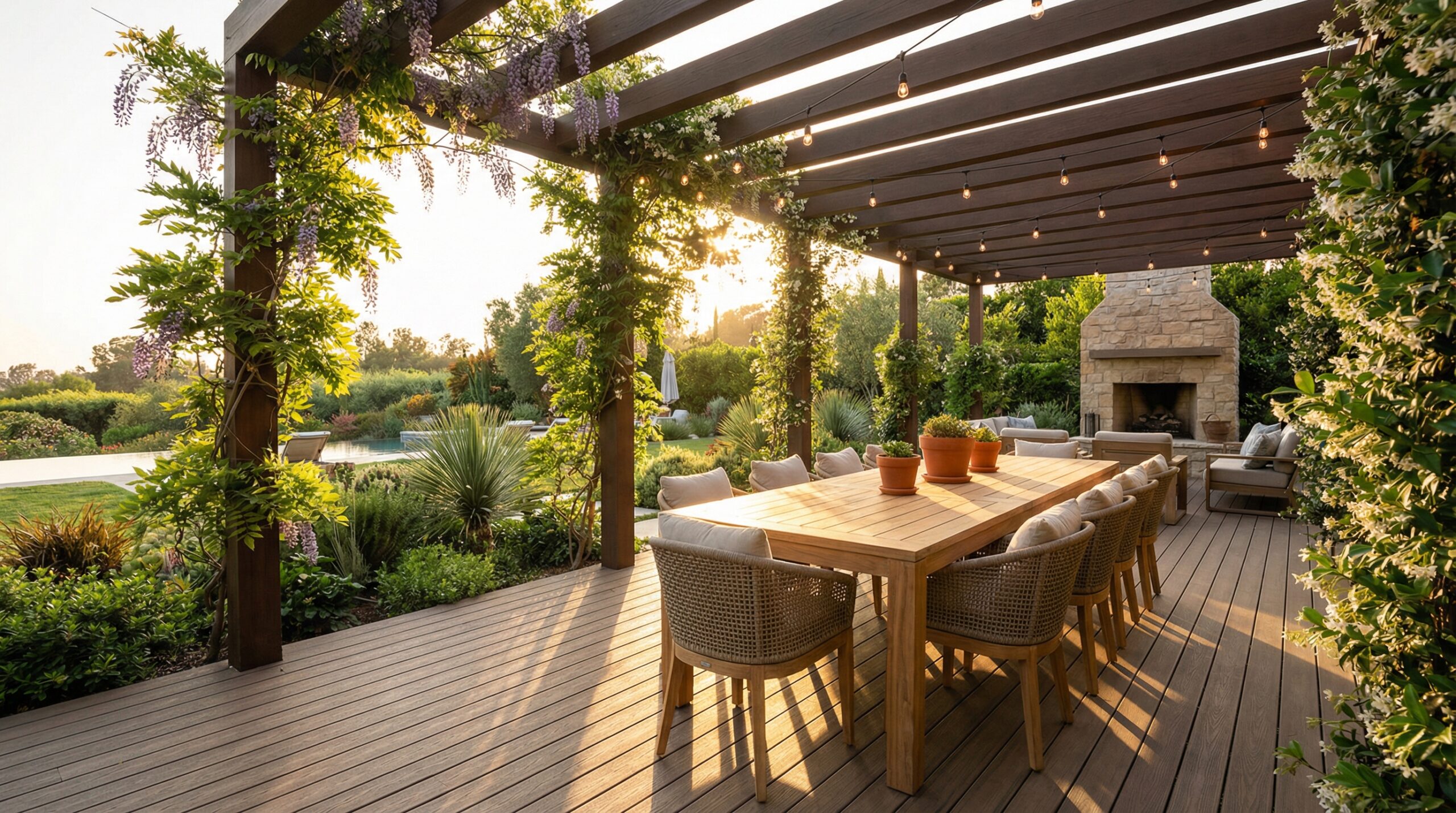 Thay vì chỉ chú trọng nội thất bên trong, các khu vực như sân vườn, ban công hay sân thượng đang được đầu tư mạnh mẽ. Đây chính là nơi gỗ nhựa ngoài trời phát huy tối đa giá trị, đặc biệt khi kết hợp với pergola – giải pháp kiến trúc giúp tạo điểm nhấn không gian một cách ấn tượng.
